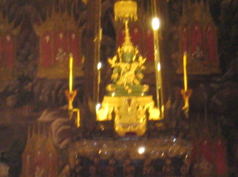 ![]() エメラルド仏 翡翠の仏像、黄金の僧衣 3・7・11月に着せ替える。 コイン博物館に複製がある。 ラオスのビエンチャンのワット・プラケオの本尊であったそうだ 高さ66cm幅48.3cm, エメラルド仏(暗くてぶれてしまいました) |