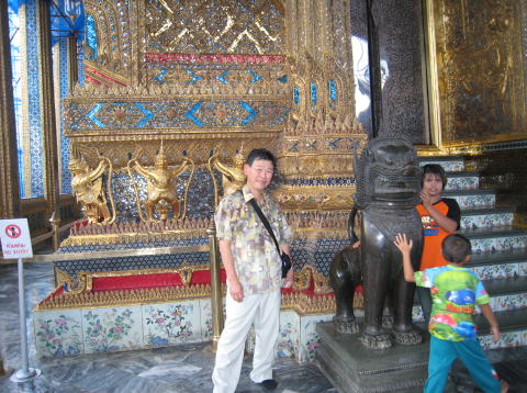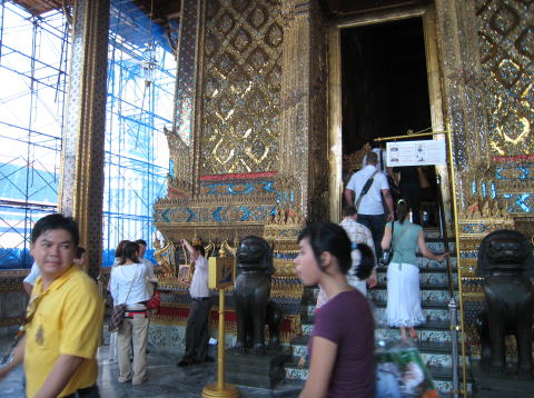 ![]() 本堂内陣 この中に秘宝エメラルド仏が 中央扉の左右に青銅製の獅子像…カンボジアから来た |