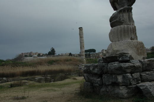 ![]() エフェソスの町に入って最初に見学したのが 豊壌の女神アルテミスの神殿 この写真はその傍らに立つ教会と砦 |