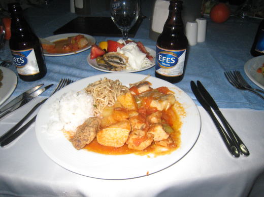 ![]() エフェソスの見学が終わってパムッカレへ 夕食はどこも似たような物 鶏肉の煮物、白身魚 ビールはエフェス |