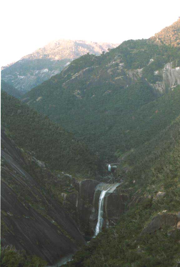 朝早かったので最初は懐中電灯をつけて歩き始めました。 30分ほどで明るくなってきました。 この日も屋久杉の古い木の株をトロッコで運んでいました。 おみやげ用のお盆とか、彫刻を作るんだそうです。 一時間ほど歩くと小杉谷の分校跡にでました。 昭和のはじめ頃は林業が盛んで、屋久島も杉を切ってどんどん九州や大阪の方に運んでいました。 そのころはこの近くにも林業に従事する人が多く、その子ども達の通う小杉谷小中学校がありました。 しかし杉の木を切り尽くしてしまい、林業が衰退し、昭和45年に、この学校は廃校になりました トロッコ道を歩いていくと正面に宮之浦岳の一部が見えてきました。 小杉谷を流れる川はとてもにきれいでした。 道のところどころに大きな杉の木がポツンポツンと出てきました。 |
