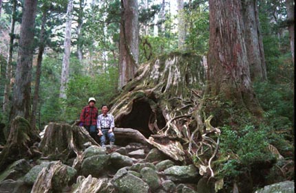 | トロッコ道を離れて、いよいよ山道を登り始めるとまもなく、大きな杉の木がありました。 大王杉というそうです。 樹齢3000年、胸の高さでの直径・胸高直径が4mあるそうです。 名前付いていない大きな杉もたくさんありました。樹齢は2000年を越えているそうです。 右の杉の切り株はウィルソン株と言われています。 大正3年アメリカから調査に来た植物学者ウィルソンという人が発見したもので、この木が切られたのは1586年、戦国時代(豊臣秀吉が全国を統一する直前ですね) 樹齢は4000年を越えているそうです。根のまわりが32mあります。 |