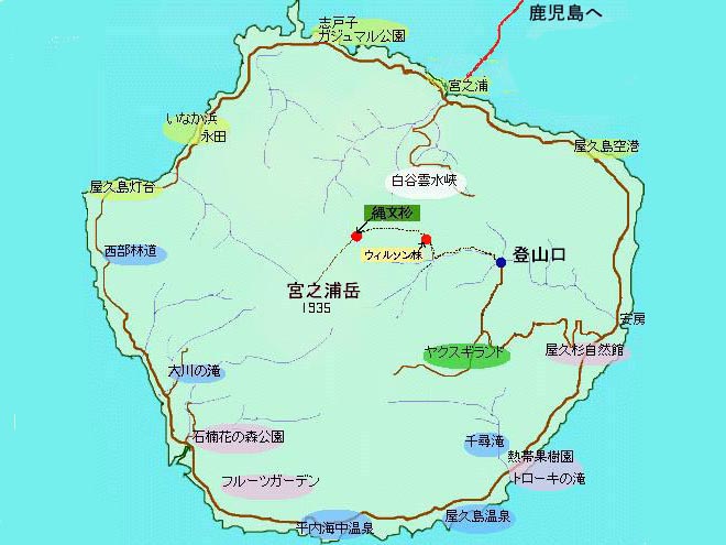 | 名古屋発8:00 鹿児島行きの飛行機に乗り、 鹿児島空港着9:20、 西鹿児島行きのリムジンバスに乗って鹿児島に降り、ました。 屋久島行きの水中翼船(トッピー)の出発は13:00だったので、出発までの待ち時間を使って市内見物をしました。 トッピーは13:00発、宮之浦港着は15:30でした 港近くの「屋久島環境文化村センター」を見学し、宮の浦の港近くのホテルで宿泊です。 屋久島は九州で最も高い宮之浦岳(1935m)が中央にそびえ、縄文杉は宮之浦岳の8合目ほどにあります。 全島山ばかりというような島で、雨量は島の中央部で年間8000oも降るという。(高森町は年間約2000mm) その雨が屋久杉を育てているようです。 屋久杉と言われているのは樹齢1000年以上の杉の木を言うわけですが、その中でも私が訪ねたかった縄文杉は樹齢7200年と言われています。 (Wikipediaでは縄文杉の樹齢は古くとも4,000年以上はさかのぼらないとするのが定説になっている。またこの名は 奔放にうねる幹の造形が縄文土器に似ているからという説がある。)とある。 それでも、日本で一番長生きしているんじゃないかなと思いました。 2日目は朝、まっ暗い5時に起きレンタカーで登山口に向かいました。 登山口から縄文杉まで4時間半といわれています。 登山口に6時に到着、懐中電灯をつけて歩き始めました。最初は林用軌道を歩きます。 |