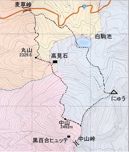 | 丸山への登りは樹林帯の中、登山道は前日の雨のせいか水が流れたり、ぬかるんでいました。30分ほど登ったところで、二歳の子どもを背負って登っている家族連れに追いつきました。大変苦しそうでした。 丸山(標高2329.6m)の頂上近くの休憩地点からは東側の眺望がすばらしく、高見石、中山がすぐ近くに見ることができた。 丸山を下ると10分ほどで高見石小屋につく。右手の道をたどり、中山に向かう。鞍部は水がたまり歩きにくい。 |