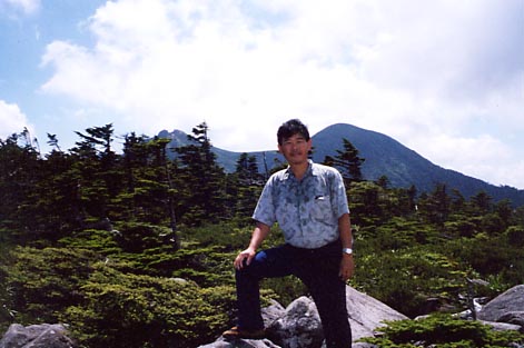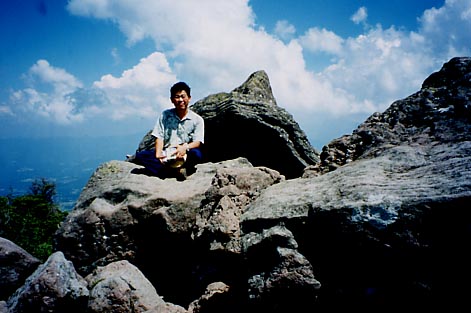 | 中山を下り、黒百合ヒュッテの直前を右折し「にゅう」に向かう。変わった名前の「にゅう」(2351.9m)は巨岩が並ぶ岩峰となっており、360度の視界がすばらしい。 右の写真はにゅうの岩山の上で |