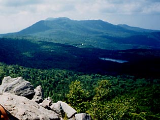 | 今下りてきたばかりの中山が目の前に広がり、天狗岳、硫黄岳が圧倒的な大きさに見える。東は小海町から奥秩父の連山が見え、北の方向にはこれから向かう白駒池が樹海の間に見える。ホシガラスが枯れ木の先端で私たちが近づいても平気で羽づくろいをしている。白と黒のまだらの模様が見事だ。 にゅうより白駒池 後方は茶臼山と縞枯山 |